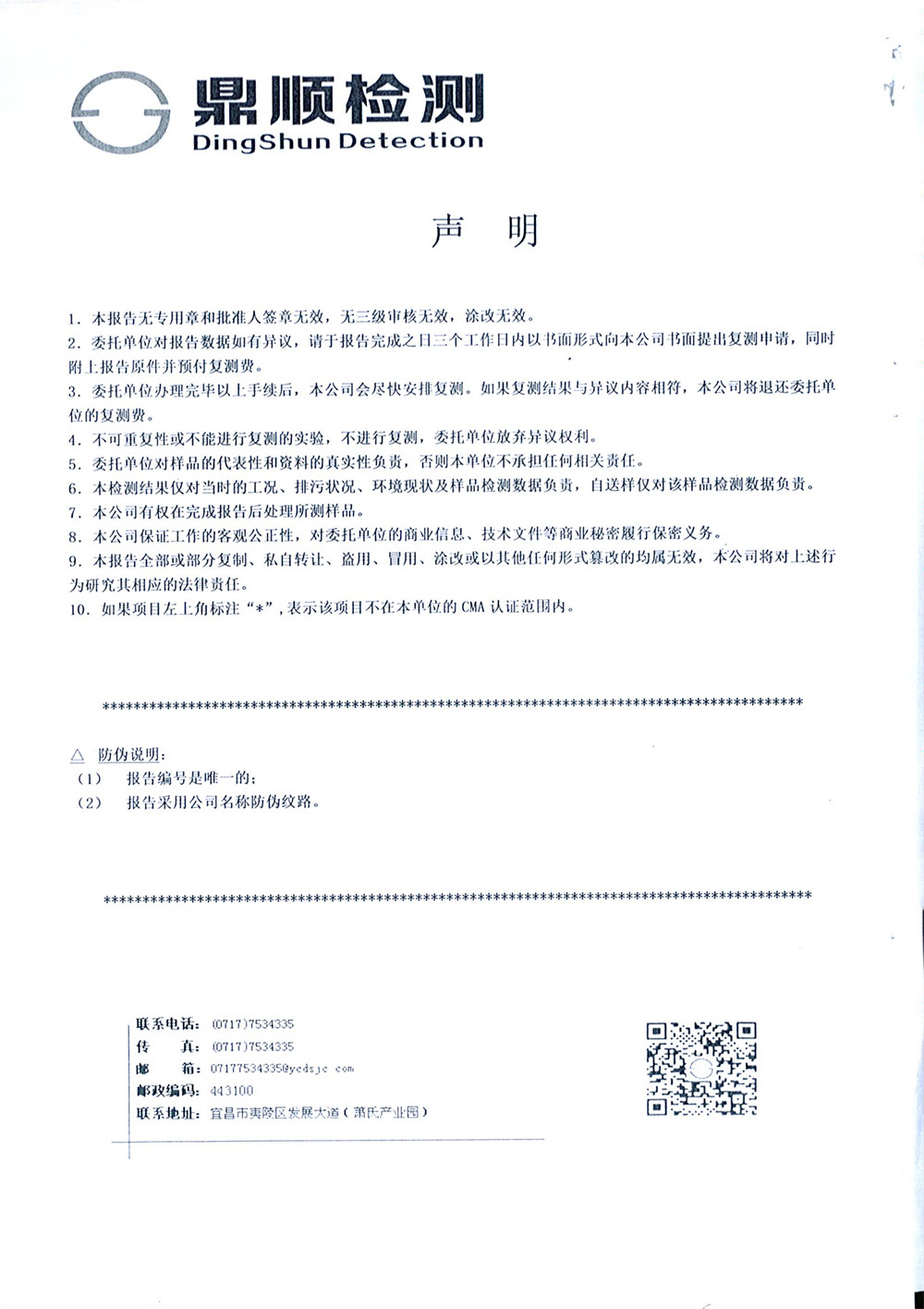 The company entrusted Yichang Dingshun Testing Co., Ltd. to carry out environmental monitoring on the waste water and waste gas of No. 2 and No. 3 sites. According to the monitoring results, both waste water and waste gas of the company were discharged up to the standard. The relevant monitoring report is as follows.