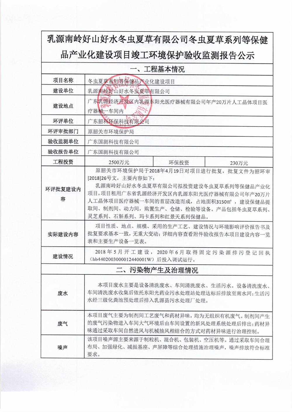 Ruyuan Nanling Good Mountain Good Water Cordyceps Co., Ltd. Cordyceps sinensis series and other health care products industrialization construction projects completed environmental protection acceptan
