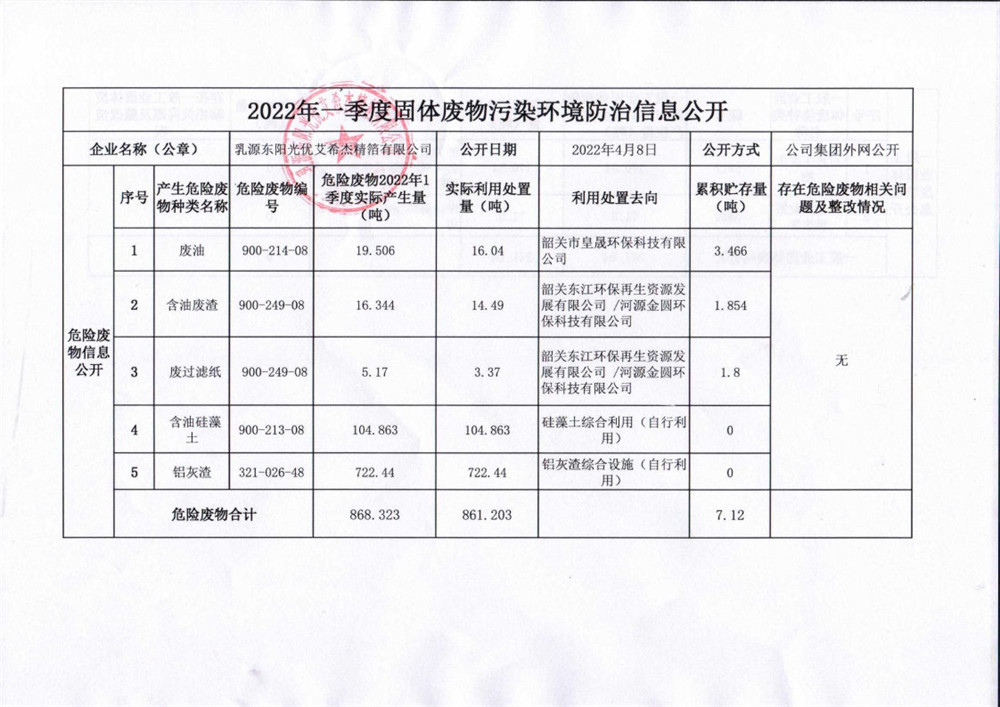 Information disclosure of solid waste environmental pollution prevention and control in the first quarter of 2022 by solid key companies (electrochemical plants, fluorine limited, refined foil)