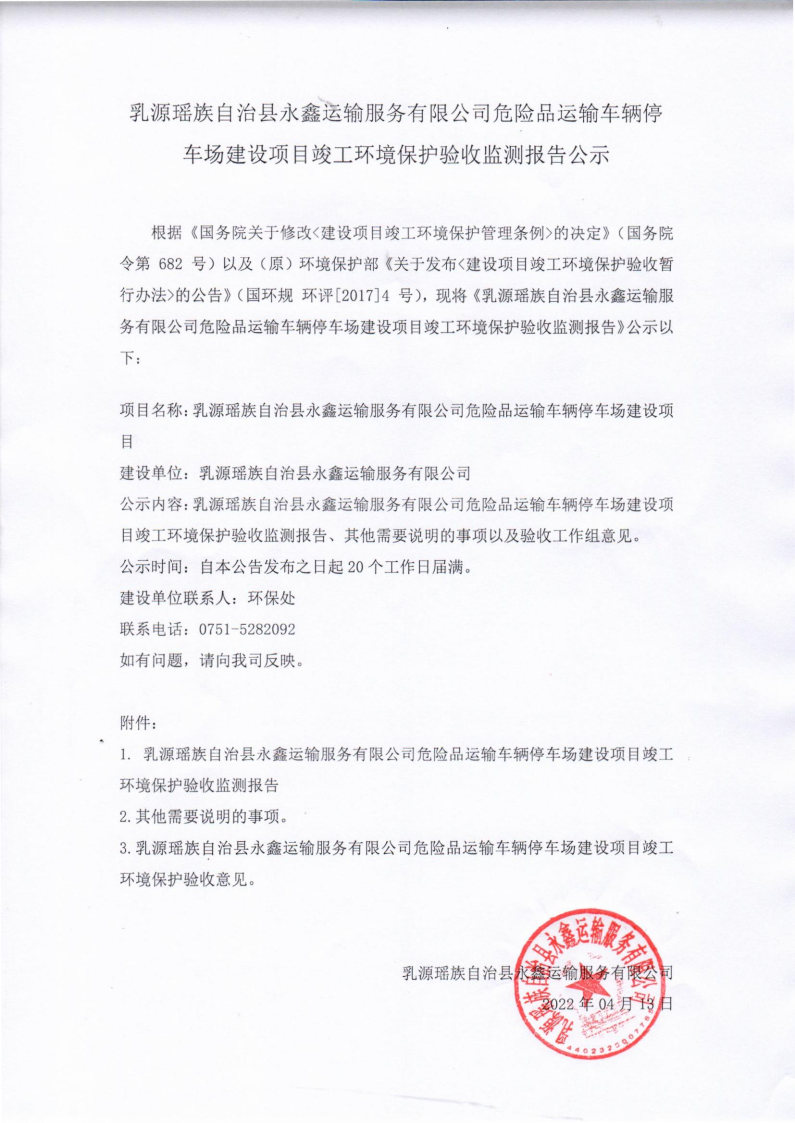 Yongxin Dangerous Goods Transport Vehicle Parking Lot Construction Project Completion Environmental Protection Acceptance Monitoring Announcement