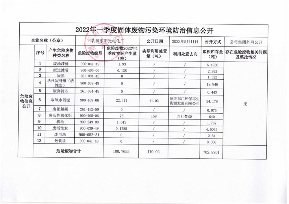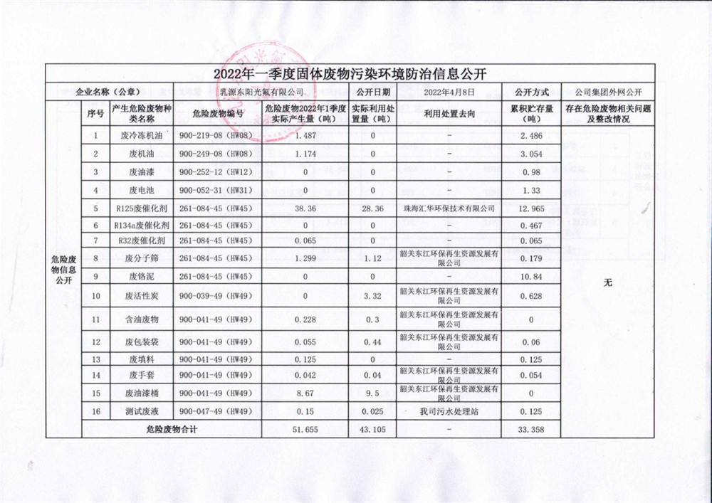 Information disclosure of solid waste environmental pollution prevention and control in the first quarter of 2022 by solid key companies (electrochemical plants, fluorine limited, refined foil)